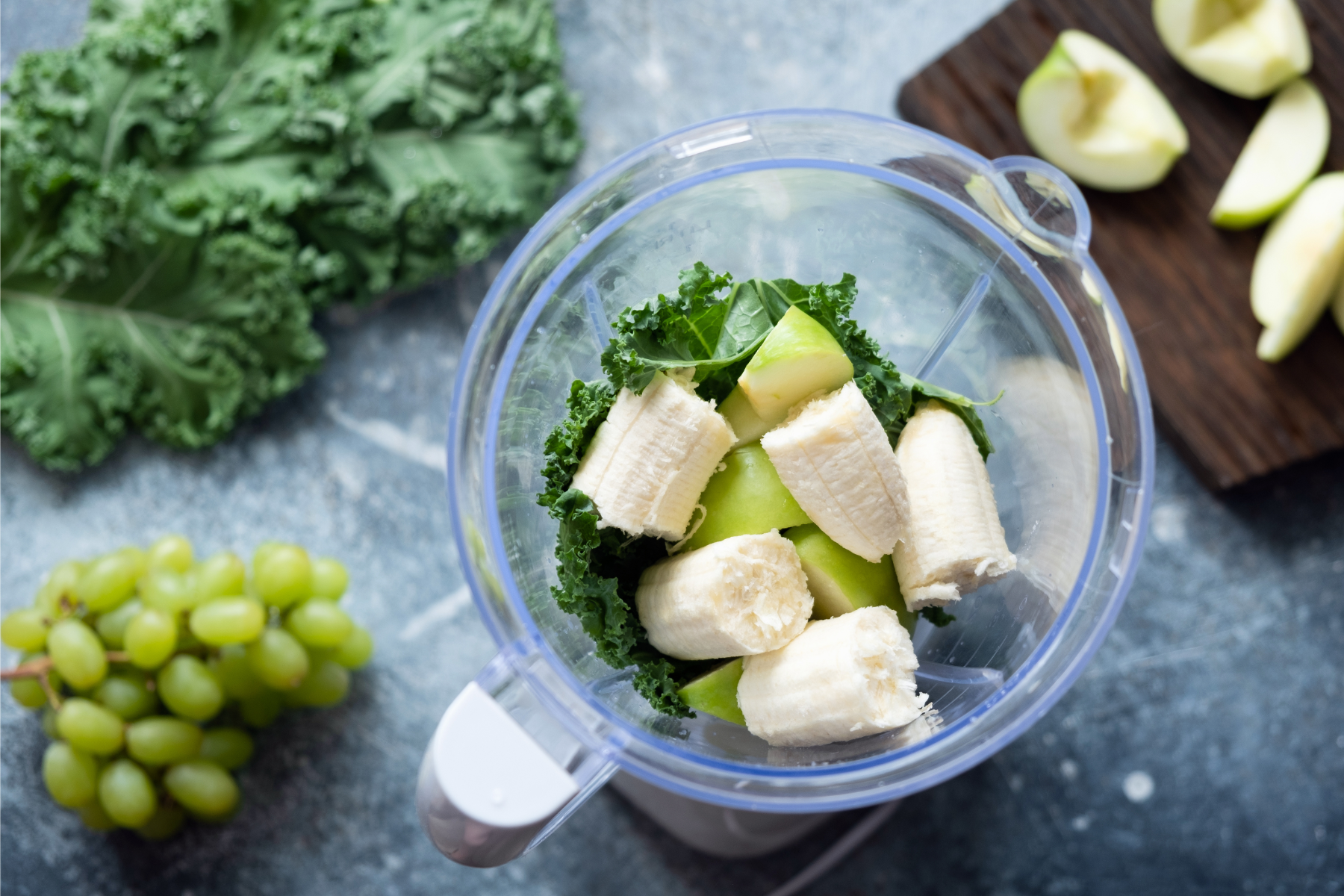 Frozen fruit like blueberries or strawberries are a good pair and has a deliciously strong taste to hide those healthy veggies you may not like. Plus, there’s no need to add ice.
